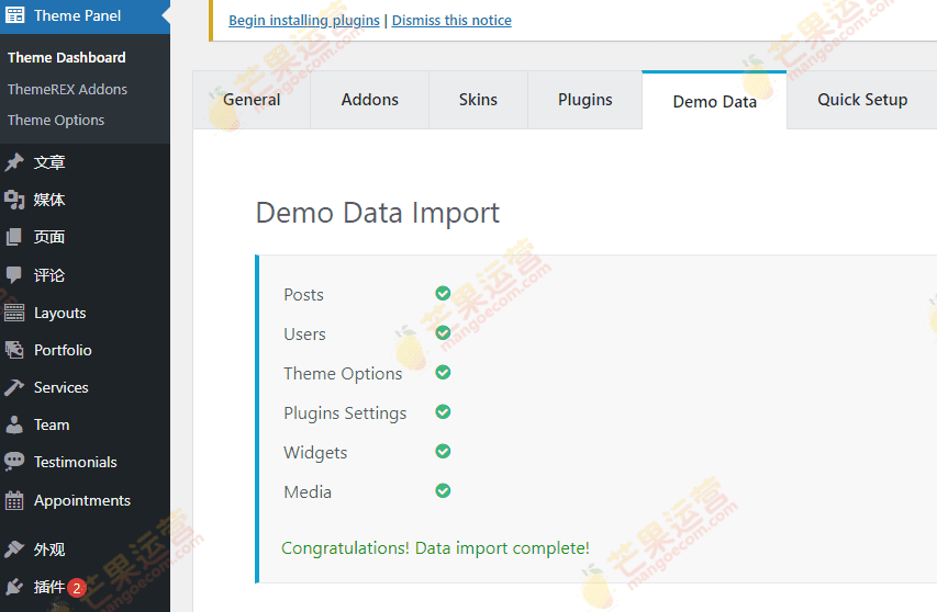 安装启用ThemeREX Addons插件后,导入demo数据成功: