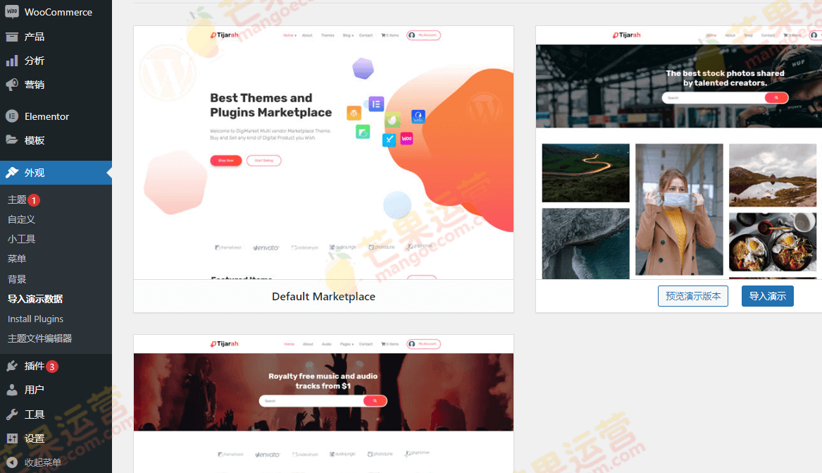 安装启用主题后,后台直接安装需要的插件,一个一个安装并启用,然后导入demo,正常使用。