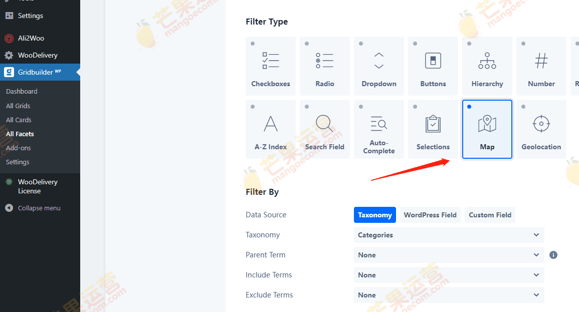 如下图,安装wp-grid-builder-map-facet.zip后,虽然add-ons页面显示未激活,但是已经多出map等选项。其他的自己测试。